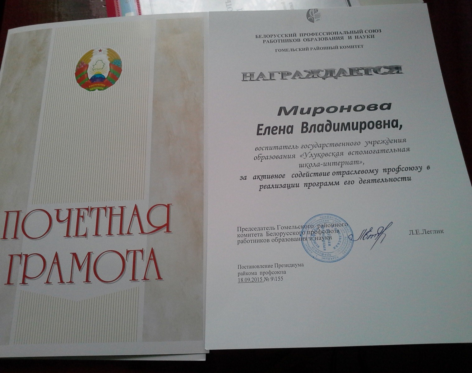 С 1999 г. по сегодняшний день — работа в государственном учреждении образования « Улуковская вспомогательная школа — интернат» в должности воспитателя