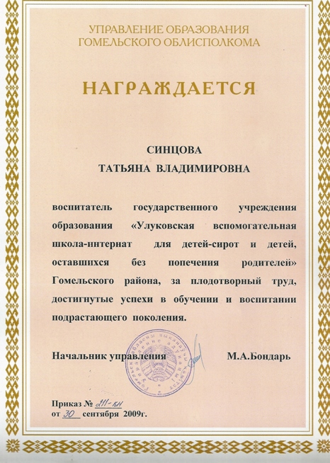 Почётная грамота Управления образования Гомельского облисполкома от 30.09. 2009 г.