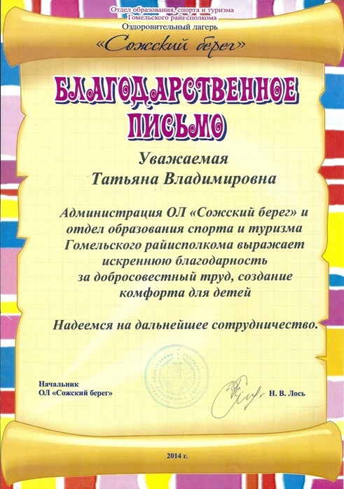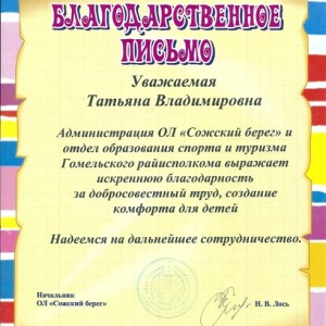 Благодарственное письмо ДОЛ «Сожский берег»