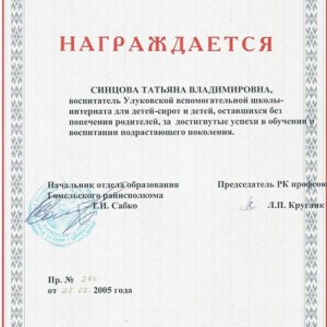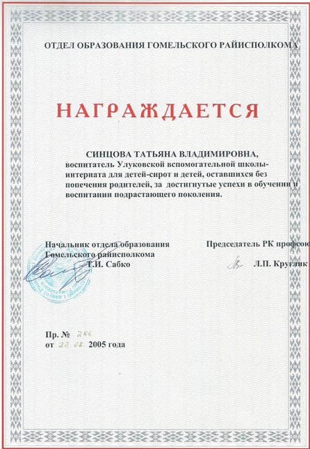 Почетная грамота Отдела образования Гомельского райисполкома от 22.08.2005 г.