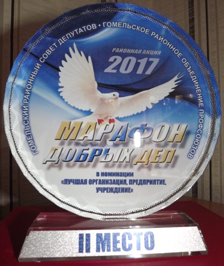 Подведены итоги районной акции «Марафон добрых дел», организаторами которой выступили Гомельский районный Совет депутатов и районное объединение профсоюзов. Наша школа заняла 2 место в номинации «Лучшая организация, предприятие, учреждение». Марафон проходил в несколько этапов. Дружно участвовали в самом первом, экологическом, «ЧИСТЫЙ МИР». С чувством глубокого уважения к ветеранам Великой Отечественной войны, храня память о тех, кто отдал жизнь за наше мирное небо, мы прошли социальный этап «ВЕТЕРАН, МЫ С ТОБОЙ!». Спортивный этап «СТРЕМИМСЯ К ЗДОРОВОМУ БУДУЩЕМУ» принёс нашим сотрудникам минутки удовольствия от спортивных состязаний. Участвуя в благотворительном этапе «ПРОТЯНИ РУКУ ДЕТЯМ», педагоги с удовольствием проводили время с нашими ребятами в играх, затеях, экскурсиях, детских развлечениях. Самым дорогим сердцу оказался этап «ДЕЛО ГОДА», который прошел под лозунгом «Не стареют душой ветераны!».