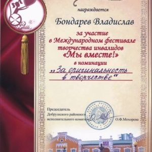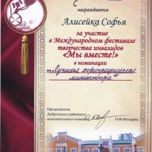 1 декабря наши талантливые ребята (Антон Тилигузов, Артём Николаев, Антон Павловский, Влад Бондарев, Алисейко Софья, Гаращенко Дмитрий, Байков Илья) приняли участие в ежегодном Международном творческом фестивале людей с ограниченными возможностями «Мы вместе!». В очередной раз мы встретились и дружно аплодировали артистам из специальных школ России и Украины, узнавали сверстников из разных районов Гомельской области, вместе с ними играли и танцевали под музыку сказочных героев Маши и Медведя. Наши малыши подарили зрителям танец «Пчёлки», а ребята 6 «Б» класса представили сказку «Заюшкина избушка», белорусский танец «На покосе» и выставку своих работ декоративно-прикладного творчества. Этот праздник надолго останется в памяти ребят, ведь вернулись не только с хорошим настроением, но и с дипломами, подарками, призом зрительских симпатий. А педагогическому коллективу была вручена благодарность от Гомельского комитета по труду и социальной защите за многолетнюю кропотливую работу, ответственность и индивидуальность в подготовке участников фестиваля. Спасибо, Добруш! Спасибо, праздник! Спасибо добрым людям!