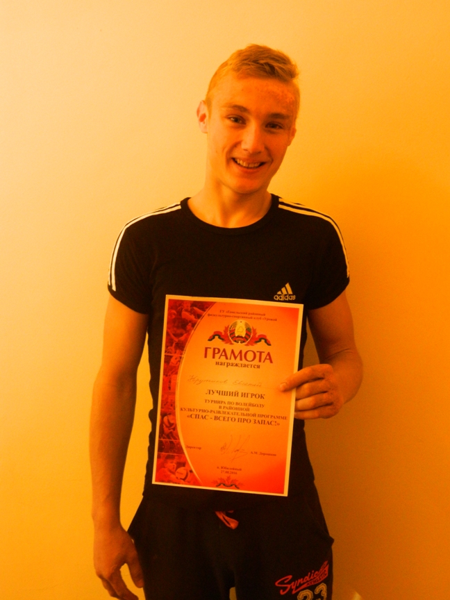 Не так давно проходило первенство Улуковского сельского совета по волейболу, в котором приняли участие 4 команды жителей данного территориального округа. Мы с гордостью отмечаем, что лучшим игроком турнира признан учащийся 10 класса нашей школы Крутиков Евгений, который выступал в составе команды аг. Улуковье, занявшей 2 место.