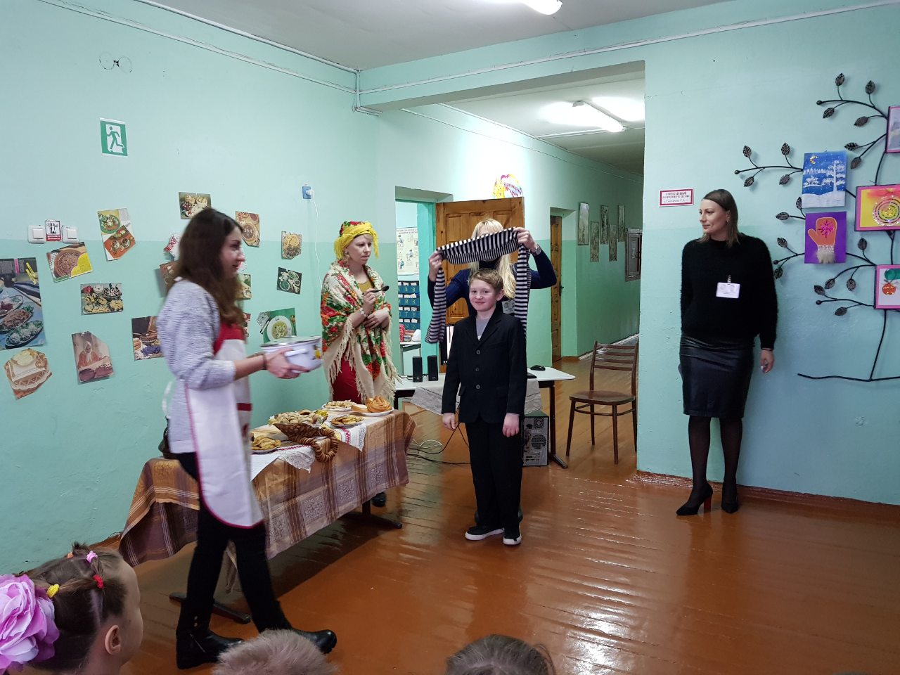Герои русской сказки «Сестрица Алёнушка и братец Иванушка» из 7 «Б» класса пригласили своих друзей за праздничный стол с пирогами.