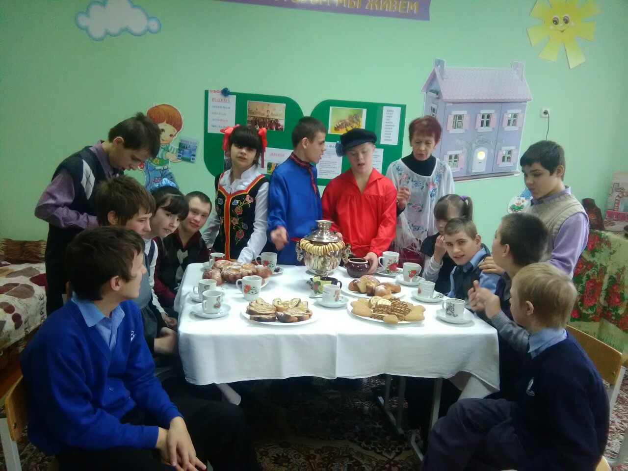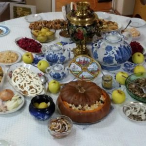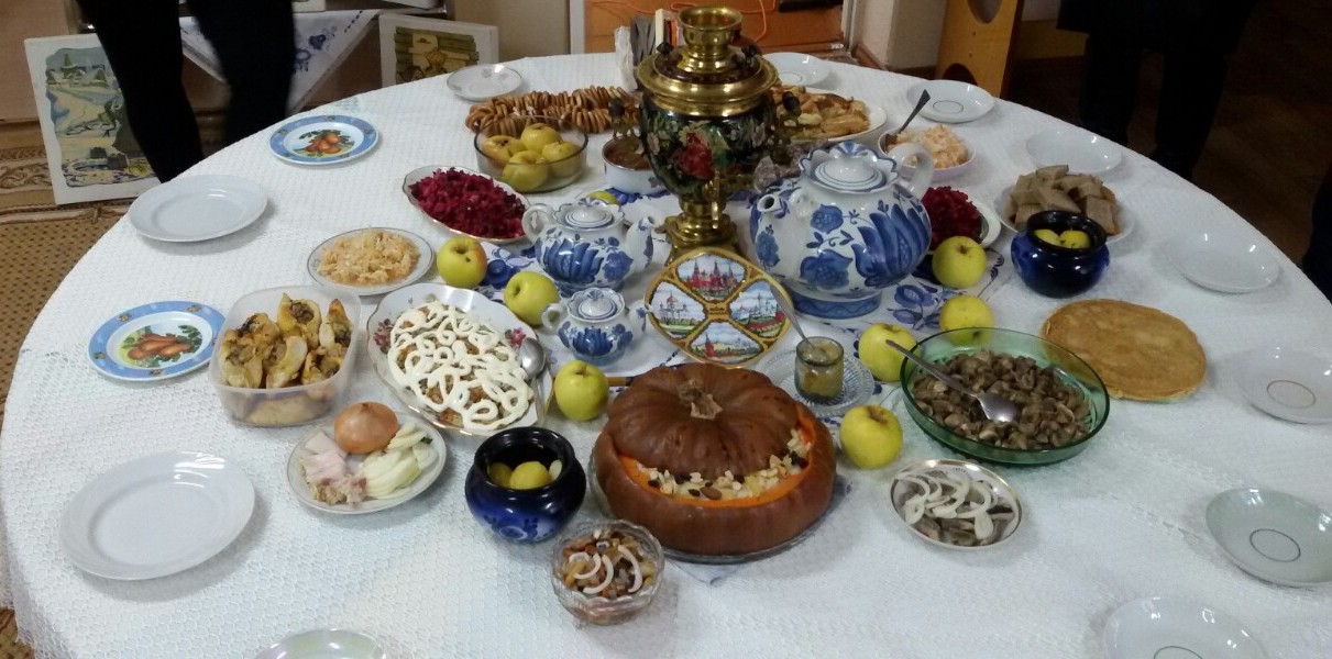 В дошкольном отделении был накрыт стол в традициях русской кухни: с самоваром, сушками да пряниками, пирогами да расстегаями, рыбой да грибами, картошкой да капустой квашеной… Вкусно то как!