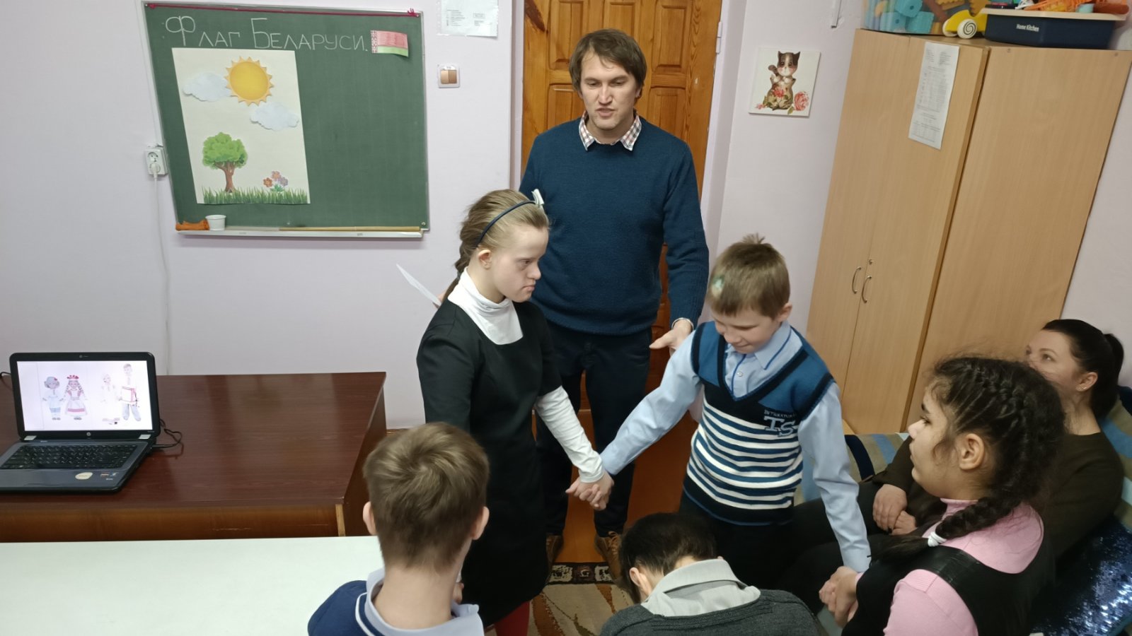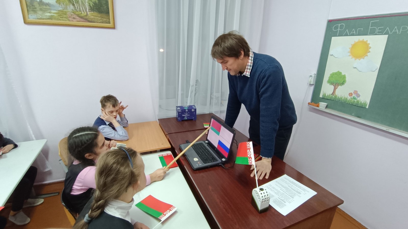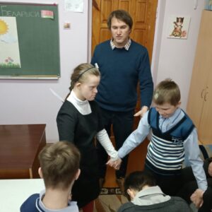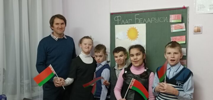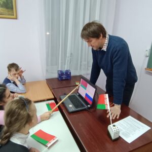 2 декабря в 4 «Б», 5 «Б» классах воспитатель Разумов Сергей Александрович провел открытое занятие в рамках УМО воспитателей второго отделения по теме «Белорусский флаг — символ Республики Беларусь». Мероприятие имело патриотическую направленность. На занятии дети узнали символическое значение цветов флага, поговорили о любви к Родине, о важности хороших поступков для нашей страны. Посредством различных дидактических игр создавались условий для расширения кругозора воспитанников в области государственной символики. Во время занятия ребята ходили на импровизированный парад с флажками — физкультминутка, закрашивали раскраски в виде белорусского флага, складывали паззл из элементов флага. Воспроизведение за педагогом стихотворения о красоте нашей Родины способствовало развитию речи детей. В конце занятия воспитанники продемонстрировали свои творческие работы и обобщили полученные представления о флаге нашей страны.