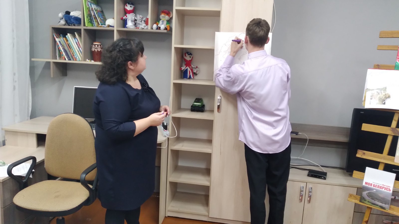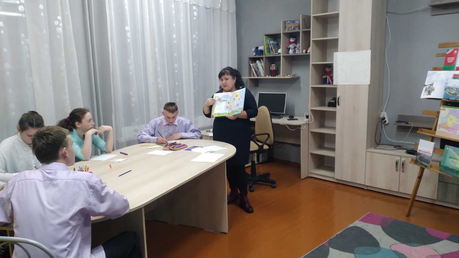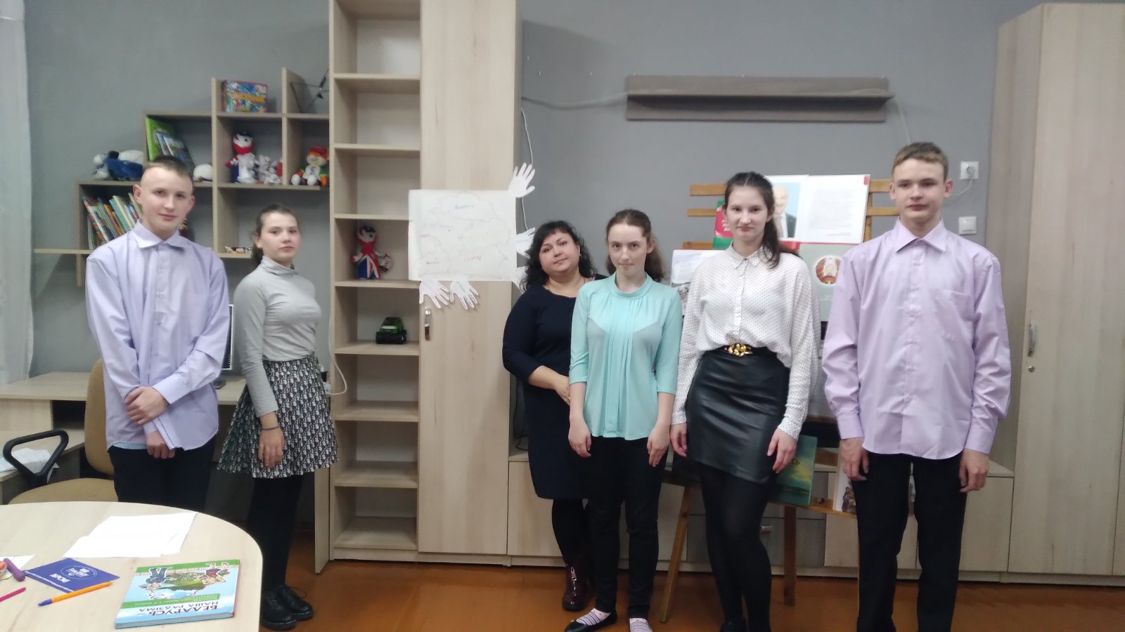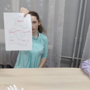 7 ноября в рамках УМО воспитателей 6 — 10 классов прошло открытое занятие в 9 «А» классе воспитателя Исаченко Юлии Александровны по теме «Моя Родина — Беларусь». На занятии дети закрепили знания о символике Республики Беларусь, административно-территориальном делении страны, поговорили о малой родине. На карту-схему нанесли областные города. Рисовали природу Беларуси. Словами описывали свою малую родину на контурах ладошек. В конце занятия создали большую карту Беларуси и наклеили на нее ладошки.