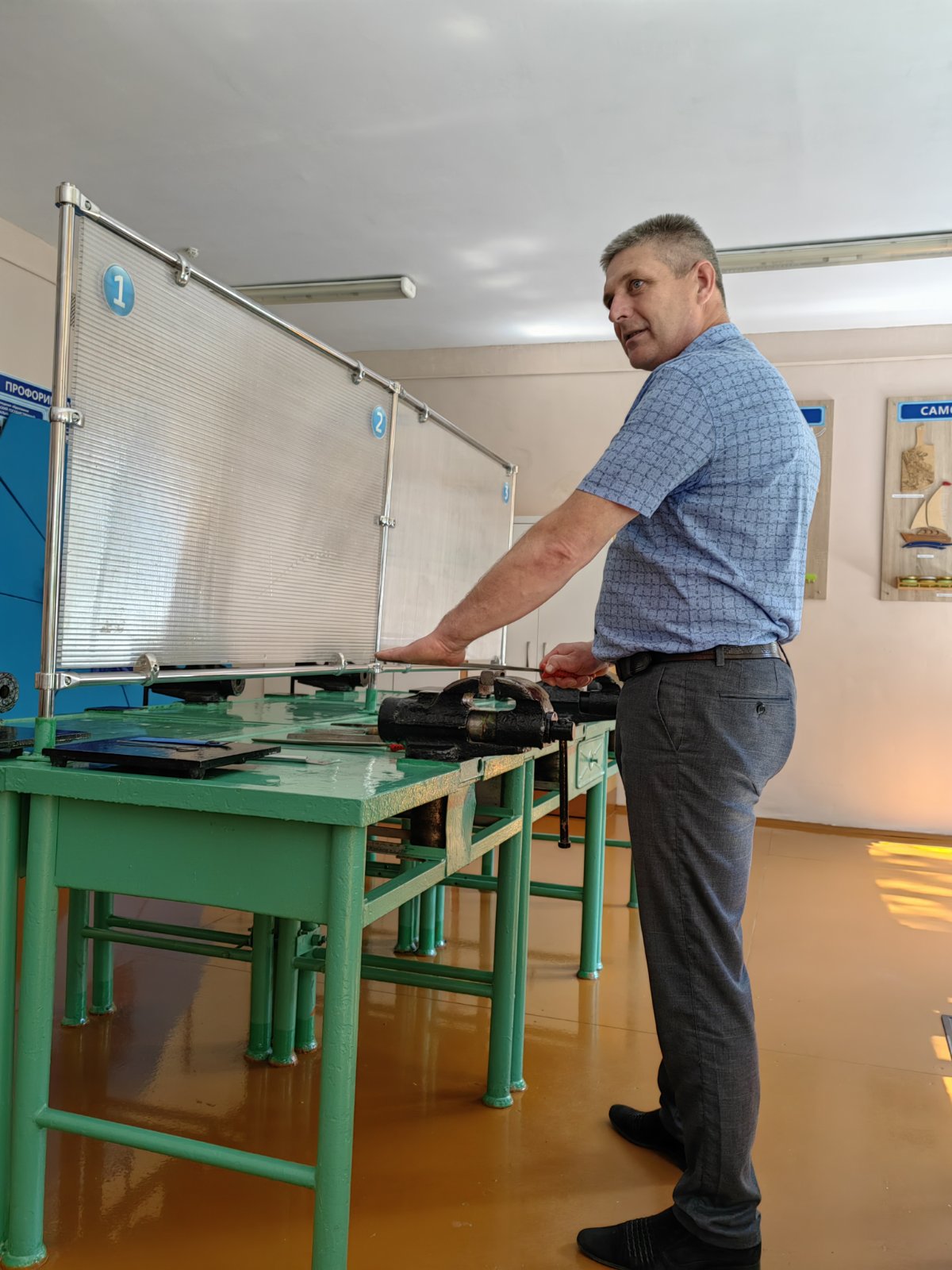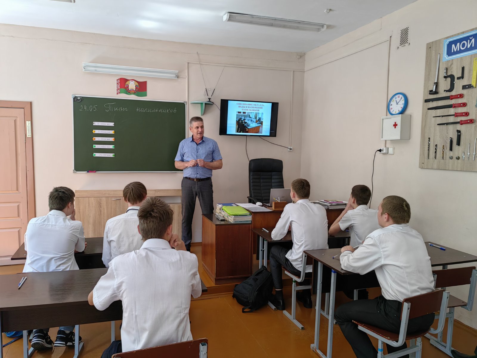 24 мая Постоловским Александром Ивановичем был проведен открытый урок трудового обучения в 10 «А» классе по теме «Опиливание поверхностей. Типы напильников». Урок был построен с опорой на презентацию. Учащиеся вспомнили типы напильников, их назначение, технику безопасности при работе с ними. Была выполнена работа по карточкам, где дети обозначили части напильника. Педагог продемонстрировал правильную хватку и положение инструмента при опиливании металла. Для закрепления знаний учащимся были предложены тест и кроссворд.
